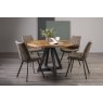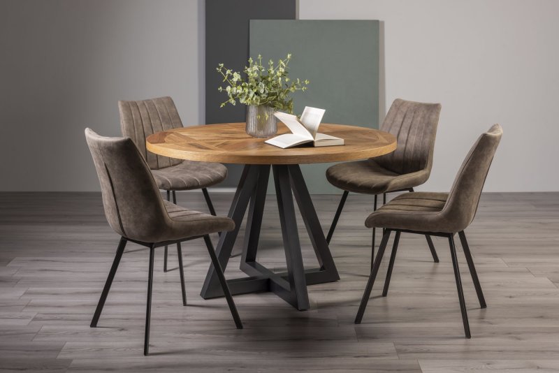 The Invictus Circular Dining Table with 4 Fontana Chairs, made from rustic oak veneer and white oak with a gun metal frame with a metal powder coating.