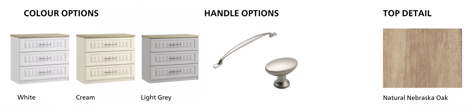 The Palma Collection is a versatile choice for any number of home interior styles. With it's clean lines and minimalist feel, this collection will provide form and function to both classic and contemporary bedrooms. The Palma collection is available in a choice of White, Cream and Light Grey with chunky Rustic Nebraskan Oak tops, as well as two handle options. A soft calming design that is a style that is sure to be in vogue for many years to come.